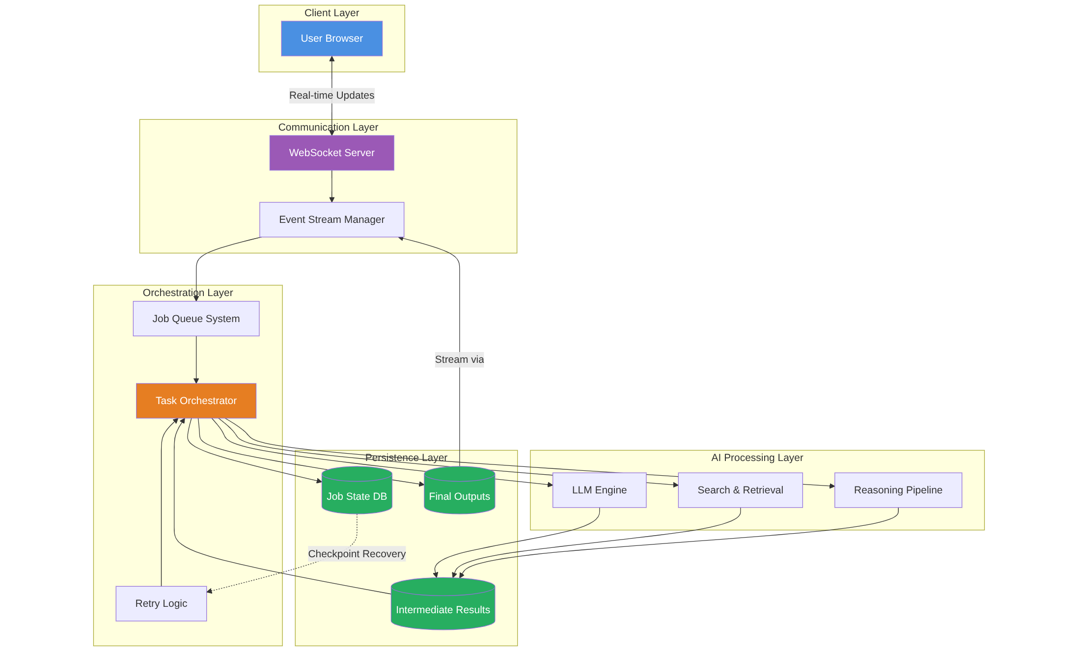 Behind the scenes? It's using WebSocket connections for real-time streaming, database-backed job management to track every step, and iterative reasoning loops that refine the research plan as it learns. Think of it like a human researcher — but instead of storing everything in their head (risky), it saves every intermediate result to a database. So if something crashes at minute 3? It picks up right where it left off. No data loss. No starting over.