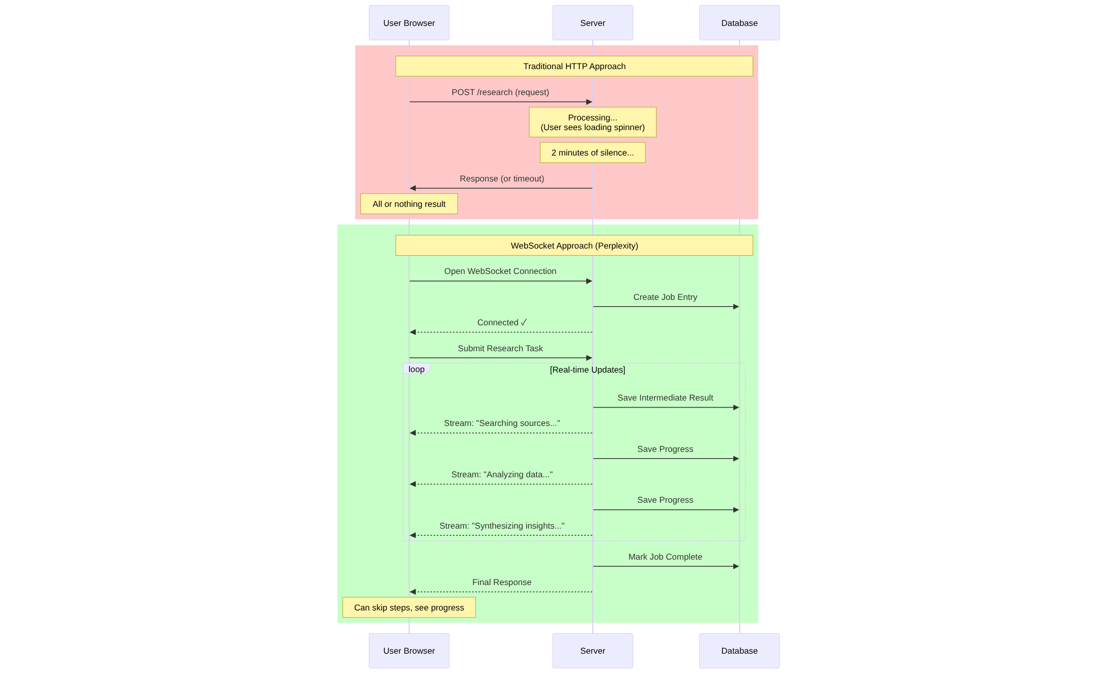 That's why Perplexity can show you "Searching sources..." then "Analyzing data..." then "Synthesizing insights..." all in real-time. It's not magic. It's WebSockets doing what they do best: keeping you in the loop as the AI works.