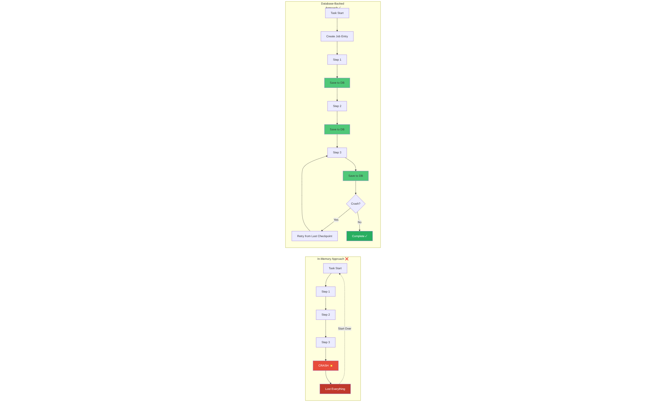 Databases give you: recovery from failures, progress tracking, audit trails, and the ability to scale horizontally. Memory gives you... speed, until it doesn't. Choose wisely.